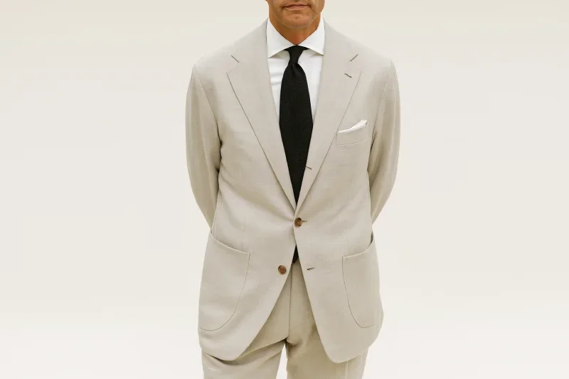 We begin with a try-on garment in plain cloth for your first fitting. Then, we make over 30 real-time adjustments directly on your body—refinements a tape measure can’t see. With those notes, your unique pattern is drafted and your suit is cut and sewn by our atelier in Amsterdam. We then meet for a second fitting in Houston to fine-tune silhouette and drape; any refinements are saved to your pattern so future commissions build on what we’ve learned. The full process typically takes five to six weeks.