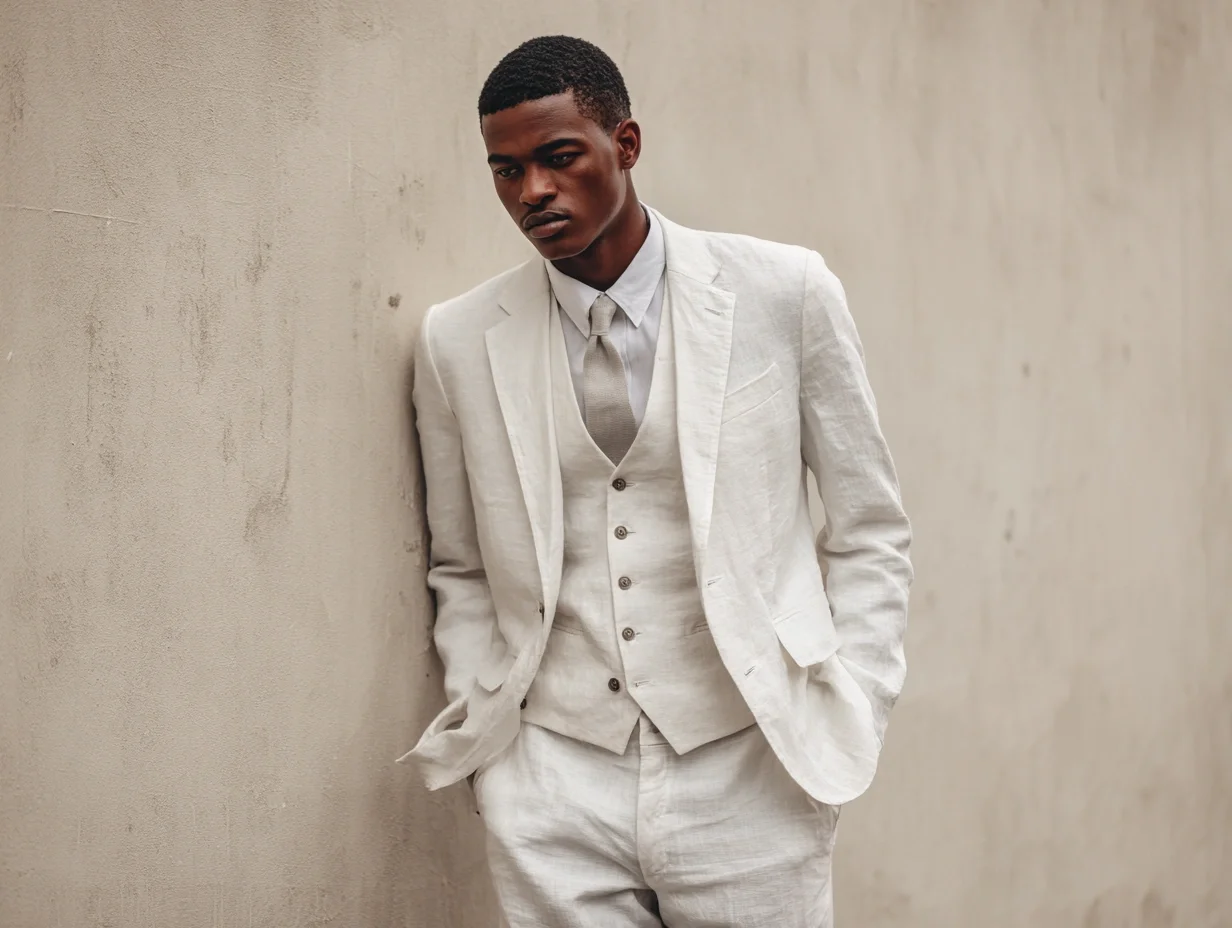 A white three-piece suit makes a dramatic statement. Sleek and minimalist when cut well, it’s ideal for warm-weather formality or high-concept events. Consider linen blends or tropical wools for structure without weight.